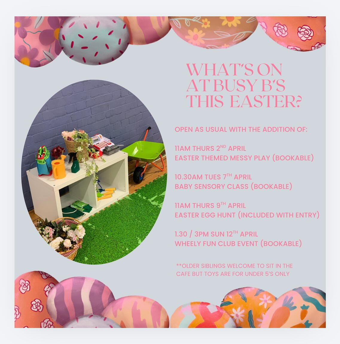 π§ 0 to 5A mix of Easter themed sessions including messy play, sensory classes and a small egg hunt.π SEND-friendly